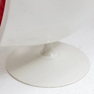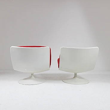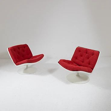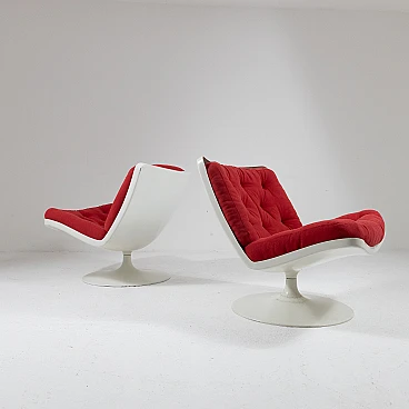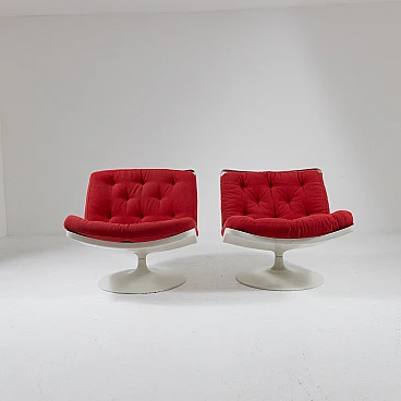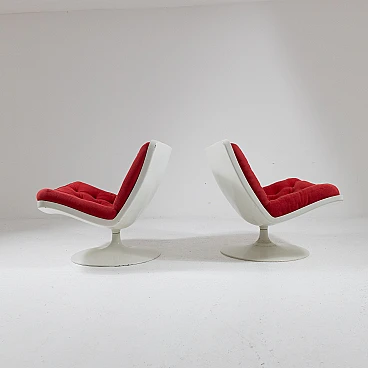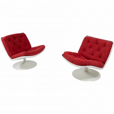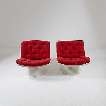 Pair of armchairs with white plastic shell and cushions with red fabric covering designed by Geoffrey Harcourt for Artifort. Signs due to age and use.