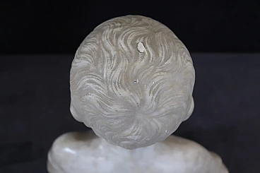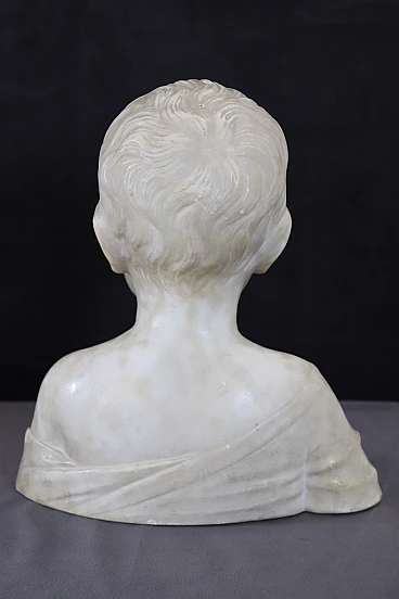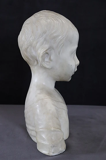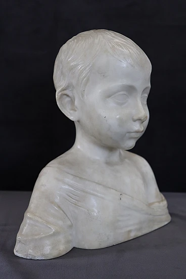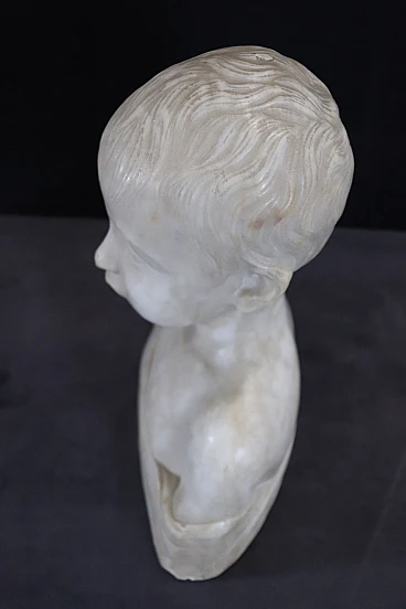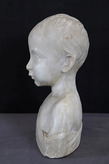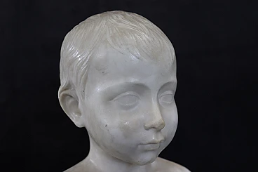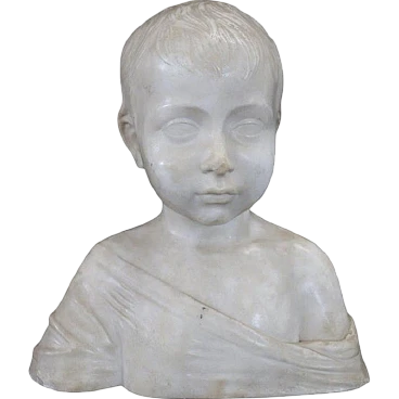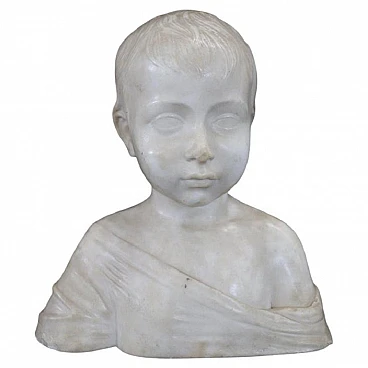 This white Carrara marble sculpture represents a splendid example of classical art, embodying the beauty and delicacy with which the anonymous artist was able to represent a child in a serene and solemn way. The work, dating back to the early 20th century, despite the lack of signature or certificate of attribution, stands out for the quality of its material and the emotion it manages to convey.