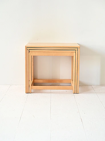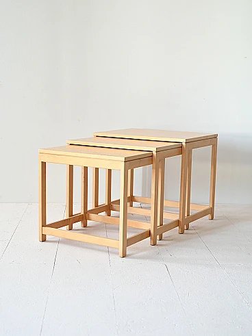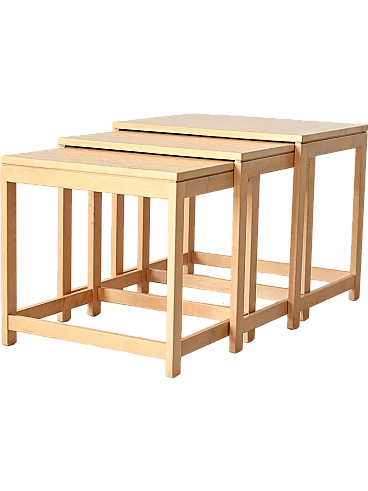 A set of three nest tables in light wood, characterized by square, essential and modern lines. The nest structure allows the tables to be stored one under the other when not in use, optimizing space and offering versatility.