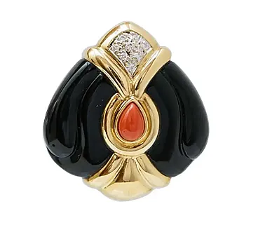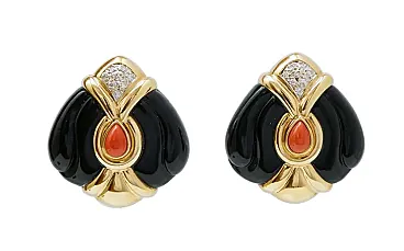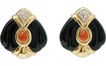 Yellow gold earrings with onyx, coral and diamonds, 1950s