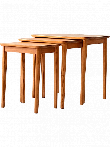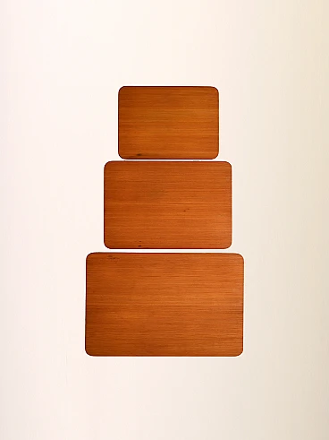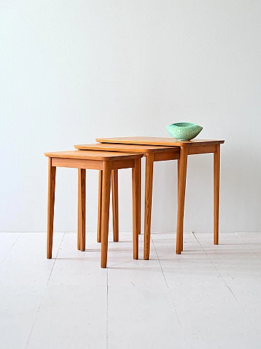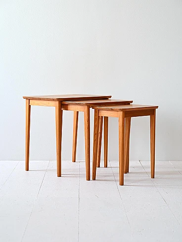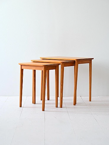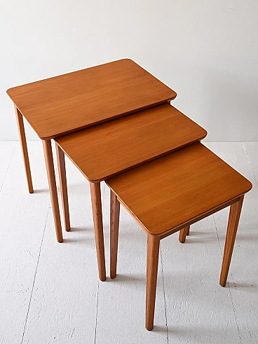 Original Scandinavian set of three nesting tables. Each features a rectangular top and tapered legs. Also ideal to use as a bedside table.