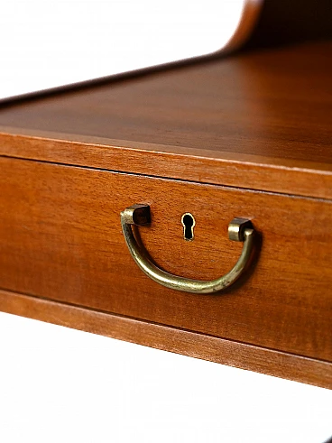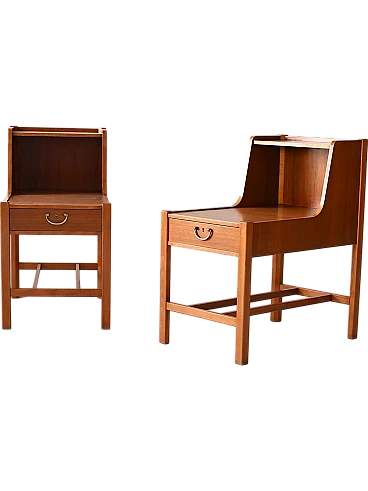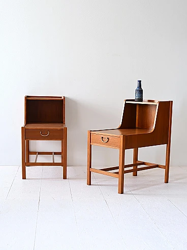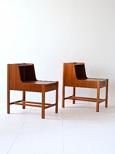 Pair of vintage mahogany bedside tables, equipped with a drawer characterized by a golden metal handle. A distinctive element of these bedside tables is the double top, which creates additional space for storing books or other objects.