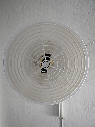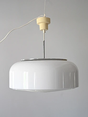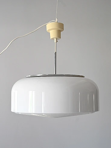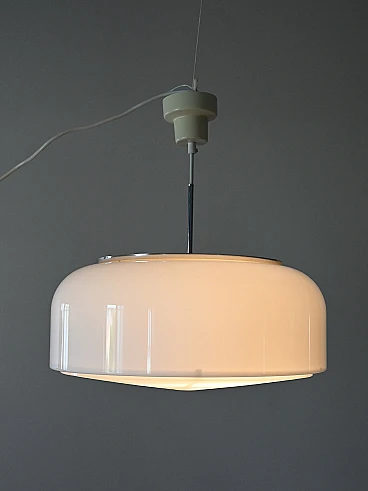 Pendant lamp designed in the 1970s by Anders Pehrson for Ateljé Lyktan. The structure is made of metal, while the lower part is made of white rigid acrylic, offering uniform diffusion of light. The minimalist design is typical of the Scandinavian style, and the adjustable cable allows you to adapt the height as needed. An authentic piece of vintage Swedish design, ideal for adding a retro touch to dining rooms, kitchens or living rooms.