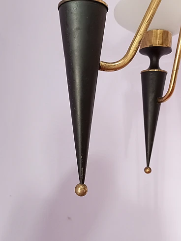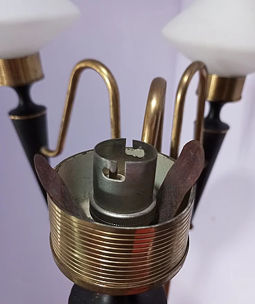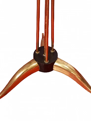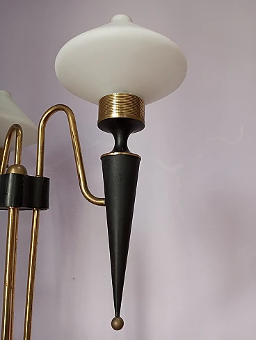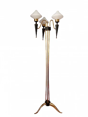 Questa lampada da terra francese degli anni '60, realizzata dalla Maison Arlus, si distingue per il suo design raffinato. La struttura poggia su una base treppiede, che conferisce stabilità. Dalla base si elevano quattro sottili fusti traforati in ottone, che donano un effetto visivo leggero e moderno. La parte superiore della lampada presenta un elemento centrale che sostiene le tre lampade affusolate con paralume in vetro bianco, mentre nasconde con discrezione l'impianto elettrico e l'interruttore. Dimensioni 160cm. x 60 cm. H lampade 37 cm. x 18 cm. diametro portalampada