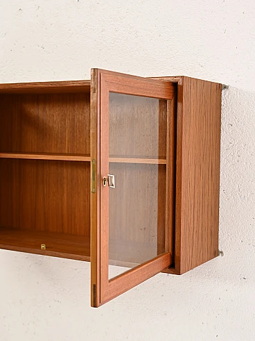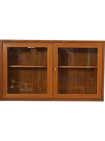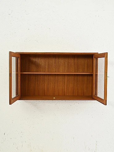 Elegant teak hanging display cabinet from the 1960s, made in Scandinavia. Characterized by glass hinged doors, it offers a refined and functional exhibition space, typical of the Nordic design of the time.