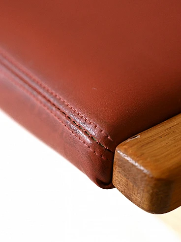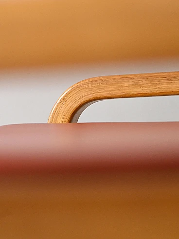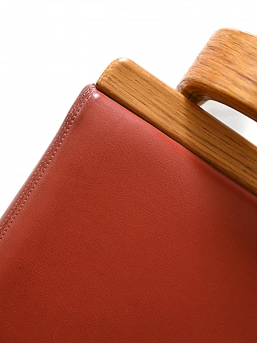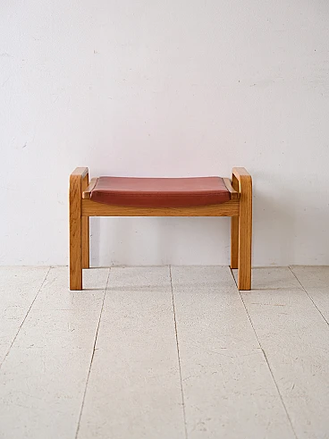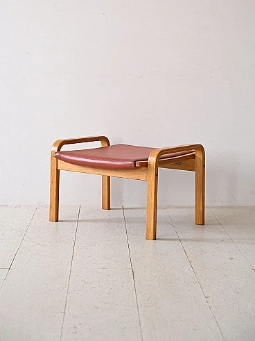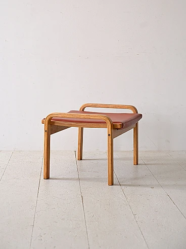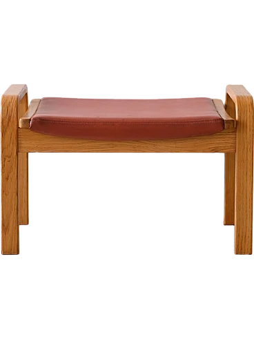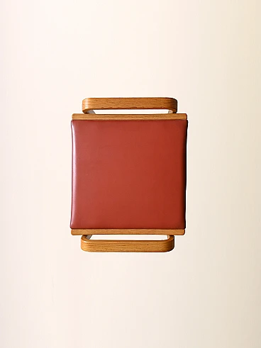 This elegant Scandinavian footstool perfectly combines the natural beauty of oak wood with the softness of tan imitation leather. The structure, made of laminated oak wood, features soft and organic lines, typical of the Scandinavian style, giving a refined and contemporary appearance.
