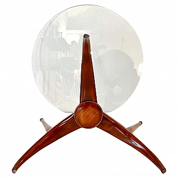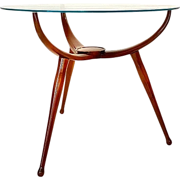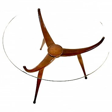 Mid Century Modern wooden spider table, in the style of Carlo De Carli Italia of the 1950s. The table completely made of solid walnut is composed of three round legs and three curved "arms" where the round glass top is positioned. The shape resembles the legs of a spider, hence the name "Spider" or Spider Table in English. Fully restored, the wood has been refinished and polished and returned to its original condition. The table is in good vintage condition with normal wear. Shipping takes place in a sturdy wooden crate and with insurance coverage. Immediate refund up to 100% in case of damage during transport. Visit our profile page to check out our constantly updated original vintage collection of over 200 pieces (and all fully restored). Significant savings on shipping costs for multiple purchases