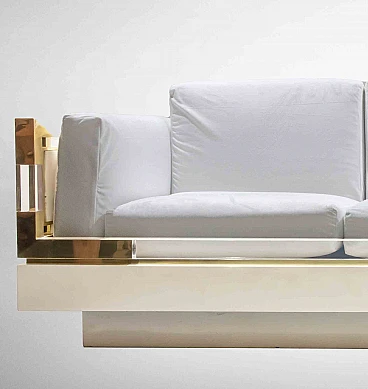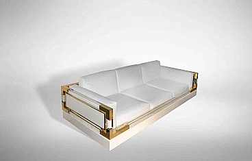Vintage white Sofa is an original design furniture item realized in the 1970s by Charles Hollis Jones.A three seats sofa in laminate, acrylic, upholstery, brass. Reupholstered in white velvet. Charles Hollis Jones (born 1945) is an American artist and furniture designer. He is known for his use of acrylic and lucite.