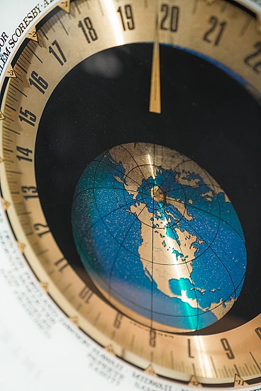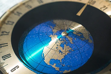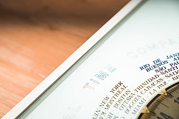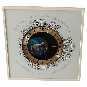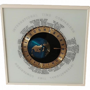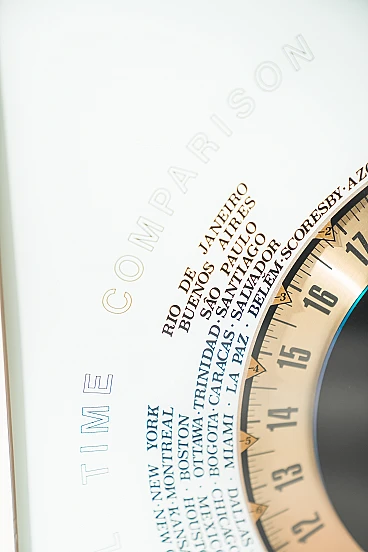 1980s "Time Comparison" World Clock – Unique 24-Hour International Time Wall Clock Enhance your space with this striking "Time Comparison" wall clock from the 1980s, designed to showcase global time zones in a beautifully detailed 24-hour format. With a glass dial listing major cities around the world, this clock is both a functional timepiece and an intriguing conversation piece. Its bold design and international focus make it perfect for collectors, world travelers, and those who appreciate vintage décor with a global touch. Key Features: Global Time Display: Shows 24-hour time for cities worldwide, allowing easy time comparison across regions. Vintage 1980s Design: Authentic piece from the 1980s with a modernist style that complements any vintage or contemporary interior. High-Quality Construction: Features a glass dial and robust build to ensure durability and visual clarity. Dimensions: Width: 26.4 in (67 cm) Height: 26.4 in (67 cm) Depth: 2 in (5 cm) Weight: 17.6 lbs (8 kg) Why You'll Love It: This vintage wall clock is ideal for adding a sophisticated, international vibe to your home or office. Its functional design keeps you connected to global time zones, while the aesthetic appeal makes it a perfect piece for anyone passionate about travel or mid-century style.