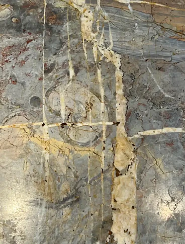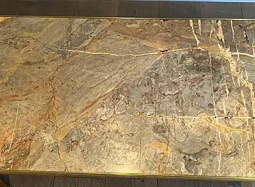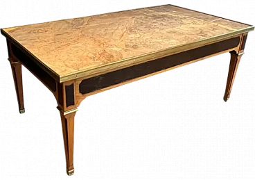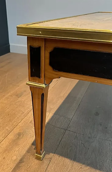 This very nice and elegant neoclassical style coffee table is made of patinated wood and brass with a marble top. This cocktail table is a French work. Circa 1940