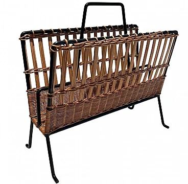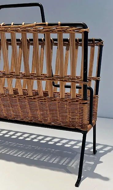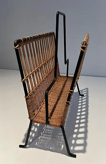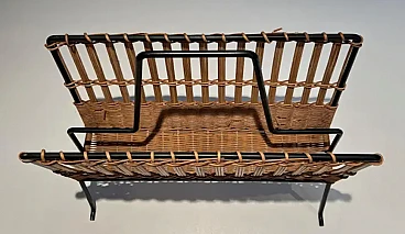 Rattan and black lacquered magazine rack, 1950s