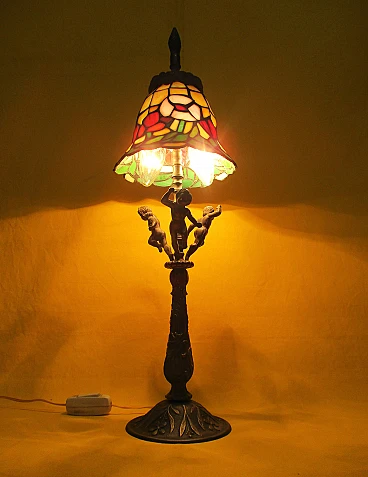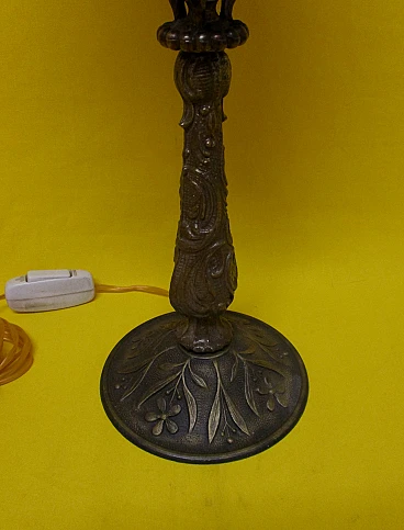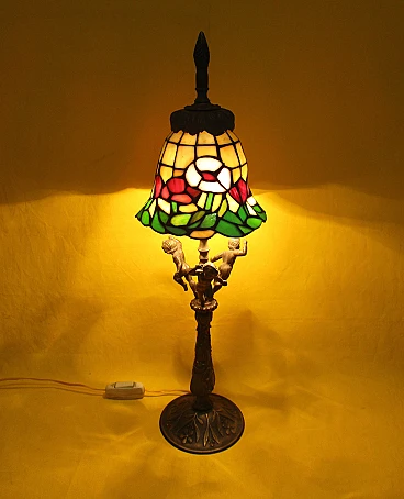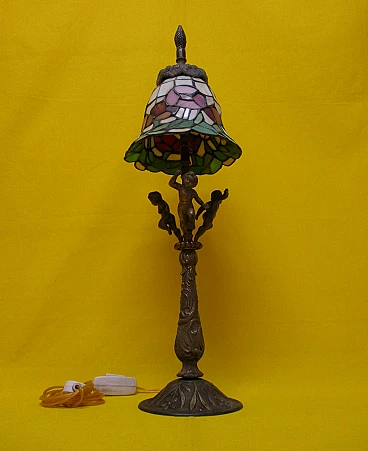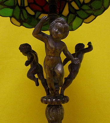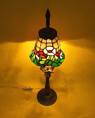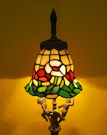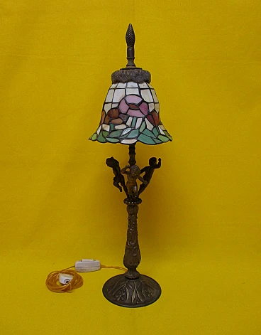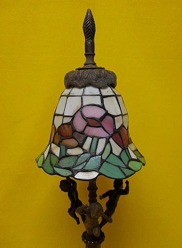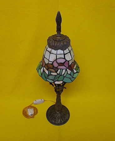 Wonderful ancient Liberty lamp from the early 1900s with double light, made of bronze with a splendid mosaic leaded glass lampshade, fitted with two E14 brass lamp holders with porcelain ring, very beautiful and of notable scenographic impact thanks also to the details made with accuracy and refinement, ideal as a furnishing object, any lighter areas are due to the reflection of artificial light, excellent condition, used, in perfect working order and as shown in the photo. Dimensions: height cm. 58 - width cm. 18