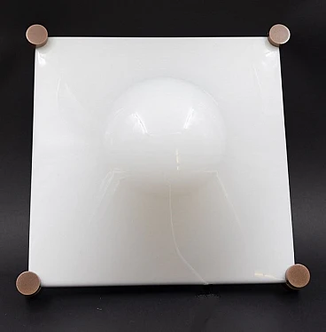Stunning original edition of the Bolla ceiling light, an icon of 70s Space Age design produced by Martinelli Luce. Being one of the first editions, the original brass and ceramic lamp holder was retained, only the wires were changed and modern 0.75 mm flame retardant ones were installed. The material is iron with the four steel joints and its methacrylate (Perspex) bubble perfectly intact and clean. The light fitting supports a normal E27 bulb, including a LED one. White methacrylate structure fixed to the base with four round steel joints. Metal wall or ceiling base. Dimensions: Height 17 cm Length 35 cm, Thickness 35 cm.