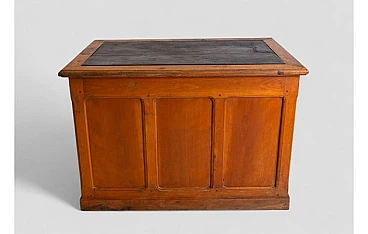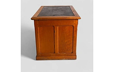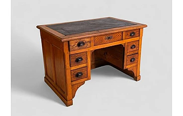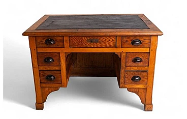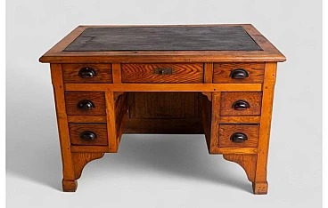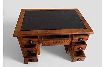 This exceptional 1940s ministerial desk in solid oak is an authentic piece that reflects the timeless style and sturdiness of vintage furnishings. with seven spacious drawers, it offers ample organizational space, while the iron handles add an industrial charm that perfectly complements the elegance of the wood. The central drawer, fitted with its original lock and key, provides a secure option for storing important documents. The desk’s top is set into the frame and covered in black vinyl leather, combining functionality and style with a refined touch. The contrast between the oak wood and the black surface creates a timeless aesthetic, ideal for classic or industrial-style settings. The side panels in larch wood enhance the robust, enduring quality of this high-quality piece. This desk is a piece of great character and functionality, ideal for those looking for furniture that combines history and practicality.
