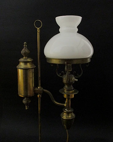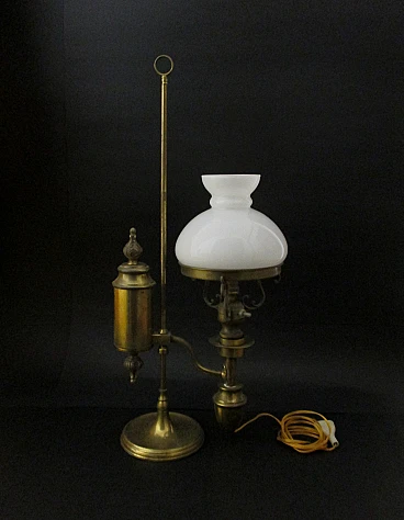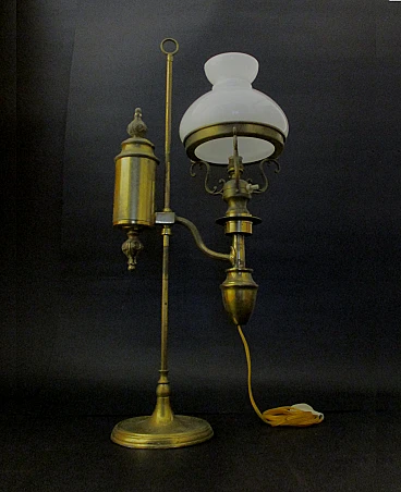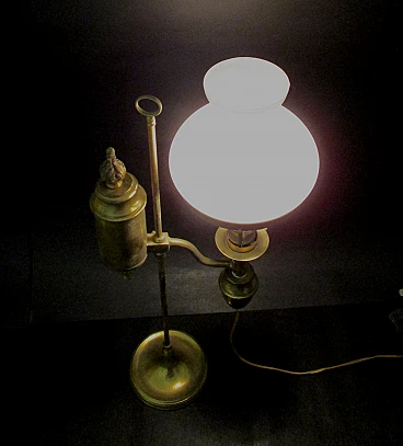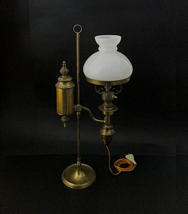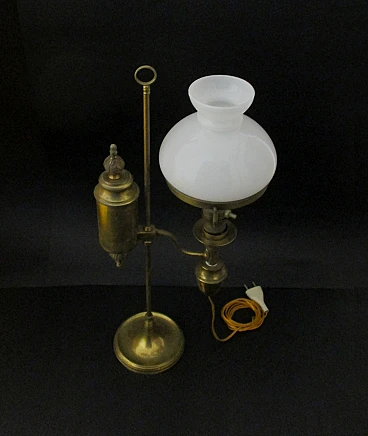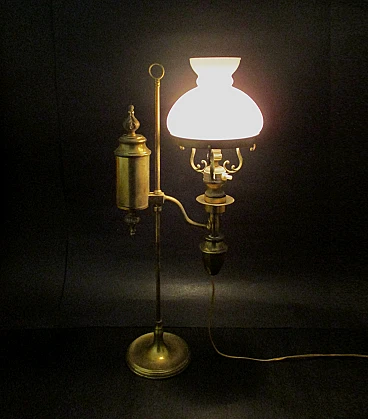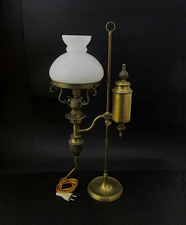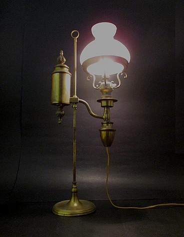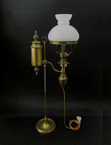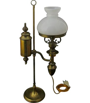 Splendid and elegant antique Liberty lamp from the 1900s, made of brass with a wonderful glass lampshade, fitted with E14 lamp holders, equipped with a switch to turn the light on and off, the lamp is adjustable as the lampshade slides up and down. Vertical supporting rod, see photo, very beautiful thanks also to the details created with accuracy and refinement, ideal as a furnishing object, any lighter areas are due to the reflection of artificial light, excellent condition as shown in the photo. Dimensions: height cm. 57 - width cm. 25 - depth cm. 15