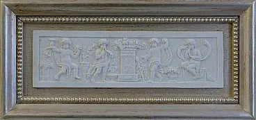 Elegant framed porcelain plate depicting an allegorical scene with amorini dancing and playing instruments. The plate is set in a silver leaf gilded wooden frame. Plate size cm.7x24