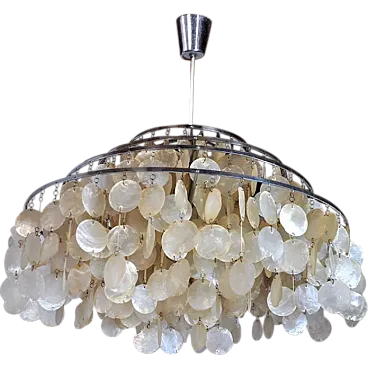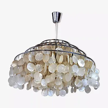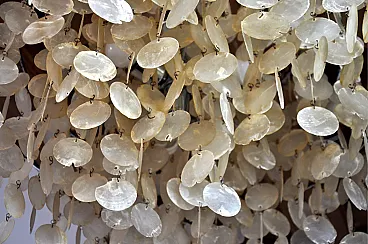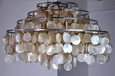 Mother of pearl waterfall chandelier. Chandelier from the 80s in the style of the "fun" series by Verner Panton. Mother of pearl distributed on 4 levels creating a magnificent visual effect. The best part: the sound of the beads when the wind blows through the window. Controlled electricity. Antique object with notable signs of aging which give the object all its charm.