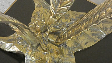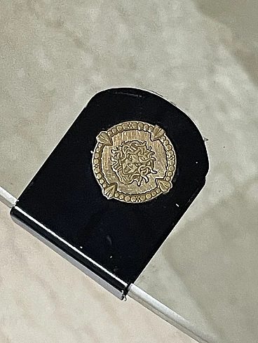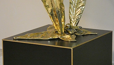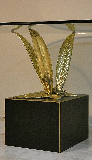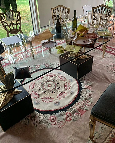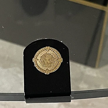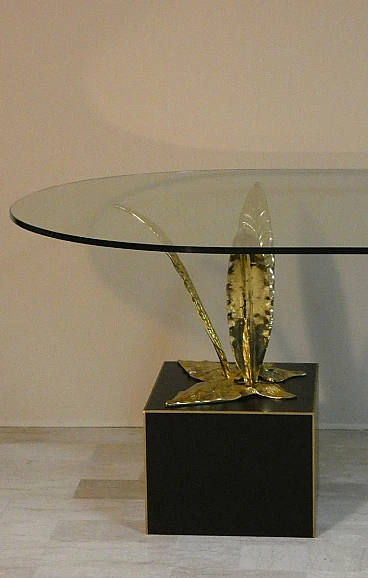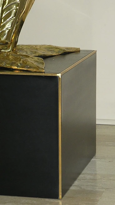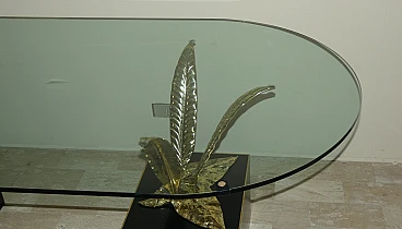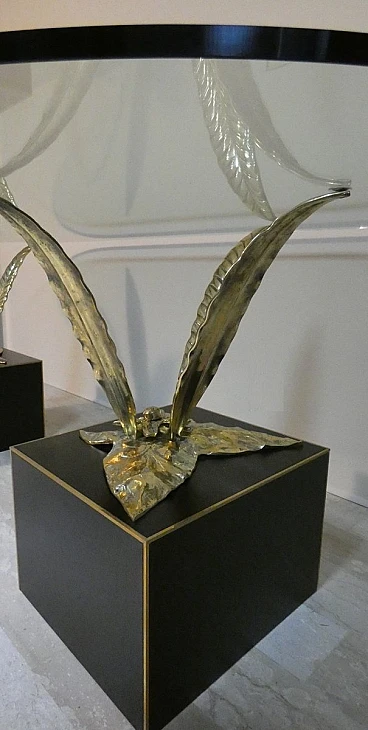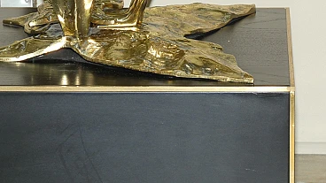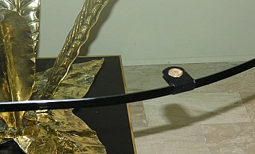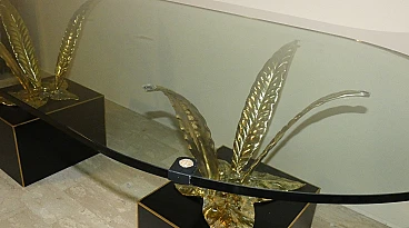 Bronze, brass and crystal table by Gianni Versace for Versace Home - Italy 1980s Exclusive and important table created in the second half of the 80s... designed by Gianni Versace for Versace Home. Of great impact, generous dimensions and with luxury finishes, this table gives an exclusive image to the environment. Suitable to be placed in a dining room but also in a representative environment, it instills uniqueness and elegance. The elliptical glass top with a significant thickness of 1.5 cm rests on two bronze sculpture elements with brass plating. The bases of these sculptures are parallelepipeds in matt black lacquered wood edged in brass. The sculptures are of significant dimensions and measure: H. 43 x L. 50 x D. 69 cm. The wooden parallelepipeds are H. 31 x L. 40 x D. 45 cm. The total dimensions of the table are: H. 75 x L. 220 x D. 110 cm The table was the central element in a dining room of a villa on Lake Como.