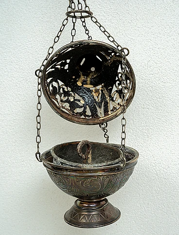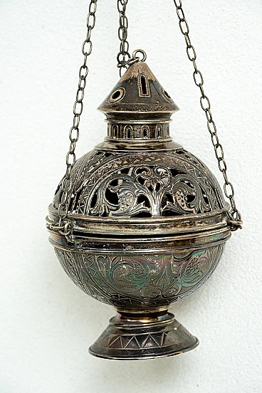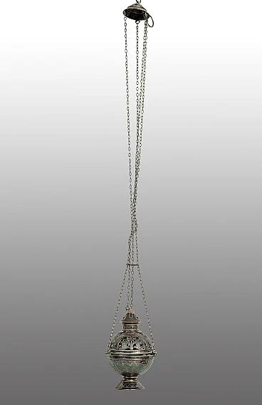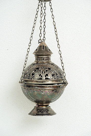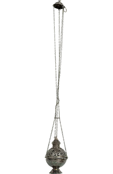 Description: The thurible is a silver or metal container to which three chains are attached so that it can be shaken, spreading the scent of the incense burning inside over a thin layer of embers. It is also called a censer.