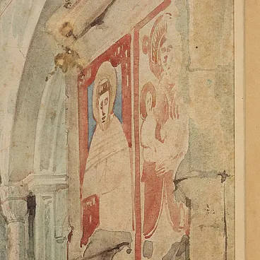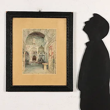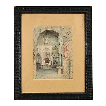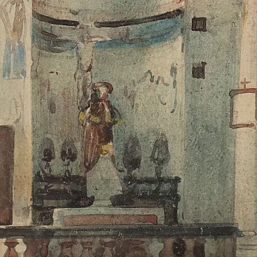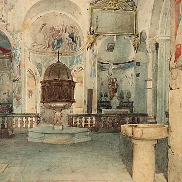 Pencil and watercolor on paper. Signed lower left. Of the same subject but with characters, there is a version on canvas by the Milanese artist, preserved in the civic Raccolta d\'arte Museo dell\'Ottocento of Villa Belgioioso Bonaparte, in Milan. Luigi Bisi specialized in interior views of churches in Lombardy, with a predilection for the Milan Cathedral. The work is presented in a frame.