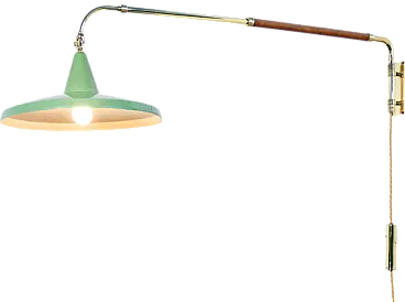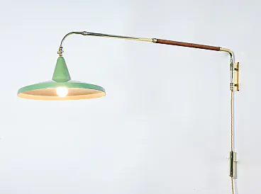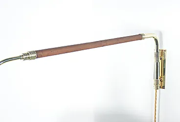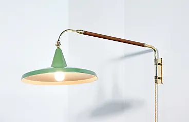Wall lamp with extendable arm and counterweight, ARREDOLUCE style. Lamp with extendable arm in two sections and revolving lampshade. The button is applied on the counterweight which facilitates the retraction of the sections. Brass structure, lacquered metal lampshade. The first section is covered in leather. The lamp is functional and in excellent condition, as can be seen from the attached photos. The system is new. Some signs of aging on the leather of the covering and on the lampshade, visible in the photo.