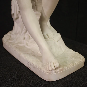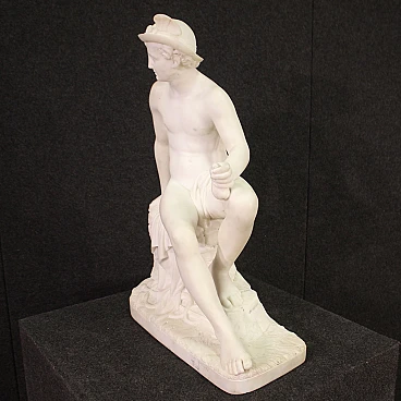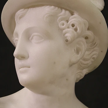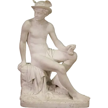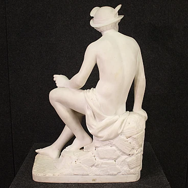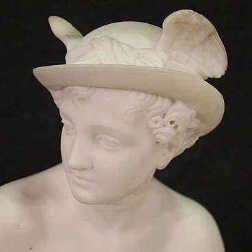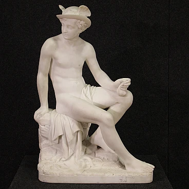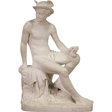 Rare Italian neoclassical sculpture from the first half of the 19th century. Work in white Carrara marble of extraordinary executive quality depicting the messenger of the Gods Mercury. Son of Jupiter and Maia, he is considered the protector of trade and travellers. We recognize its typical iconographic elements such as the Petasus, the headdress with wings, and the caduceus, the legendary winged staff with two twisted snakes symbolizing harmony. Statue with a small defect on one of the wings of the headdress (see photo), overall in excellent state of conservation.