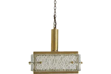 The ceiling lamp was manufactured in Sweden in the 1960s. The glass was produced in cooperation with the Swedish company Orrefors. It is characterized by the combination of brass and aluminum with glass. The shape of the lampshade and its design gives a spot diffused bottom light, and through a series of rectangular hand-molded thick glass elements in the shade, the light also spreads to the sides. You can adjust the height of the lamp's suspension. The lamp is preserved in original condition, with no damage. The metal has a patina of rubbing.