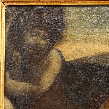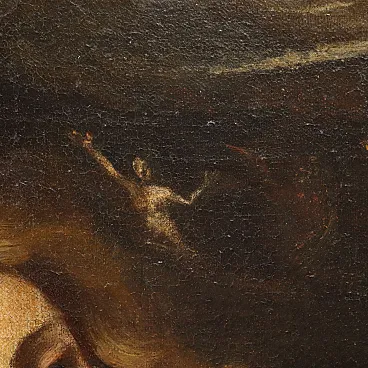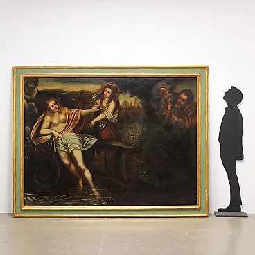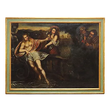 Oil on canvas. The subject depicted tells a biblical episode from the Old Testament: Susanna, the beautiful and chaste wife of Joachim, a rich Jew, is threatened by two elderly judges of the people while she is bathing in her garden. This episode has been widely reproduced in art, as an opportunity to exalt female beauty and condemn sinful voluptuousness. In the scene, the female figure of Susanna, half-dressed, sits in the foreground on the left, on the balustrade of a gushing fountain in the garden, intent on immersing herself, but pointing with her hand to the two old men on the right, who are spying on her, hidden behind a bush. Unusual in the scene is the figure of the other woman, probably a maidservant of Susanna, also half-dressed, probably introduced to further exalt female nudity. In the background appears the garden of the villa, characterized by symmetrical and regular flower beds. Also peculiar is the presence, in the distance behind Susanna's head, of three stylized figures, who seem to run towards her, perhaps to warn her of danger. The work, in the first canvas, has a slight break in the upper left, and small spots of paint. It is presented in an early 1900's frame.