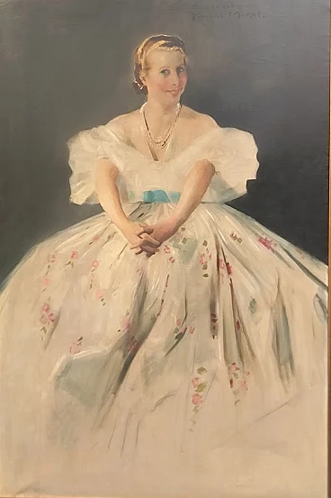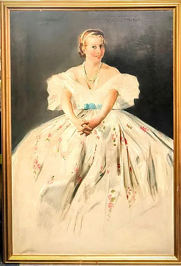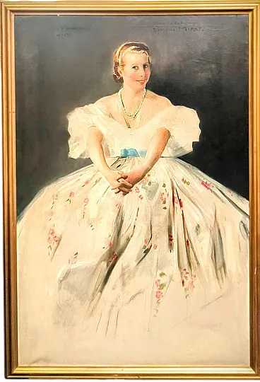 Oil on canvas Ch. J. Watelet signed and dated with dedication, with original frame. Portrait of the French singer and actress Simone Mirat. Oil on canvas from 1935 with hand-gilded frame with matt gold leaf.