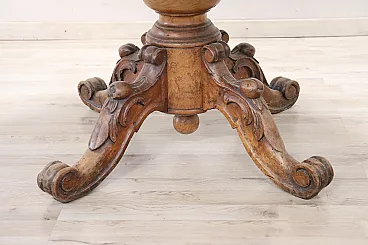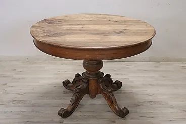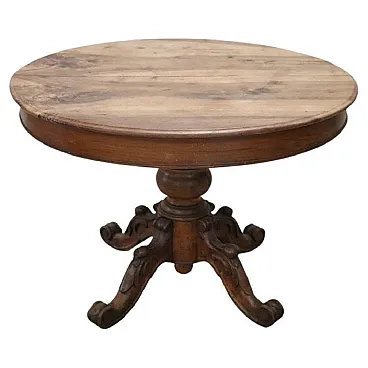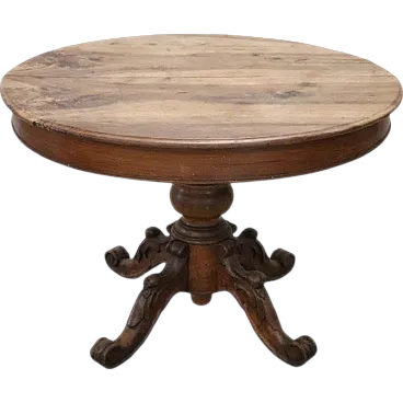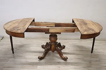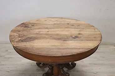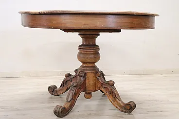 We are pleased to present to you this beautiful and significant antique round dining table, crafted from solid walnut in the mid-19th century. Designed to be both functional and elegant, this dining table features a central extension mechanism allowing you to host larger gatherings numerous. The imposing central leg is finely turned and adorned with intricate carvings of fruit and leaves, supported by four sturdy feet that guarantee stability and style. When the table is fully extended, two small turned legs on the sides lower to increase stability, making it perfect for entertaining and convivial dinners.