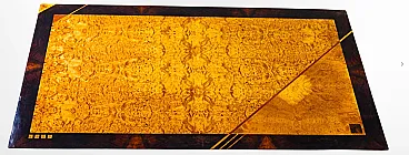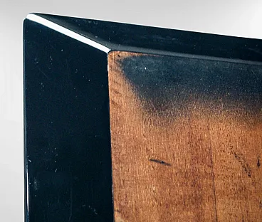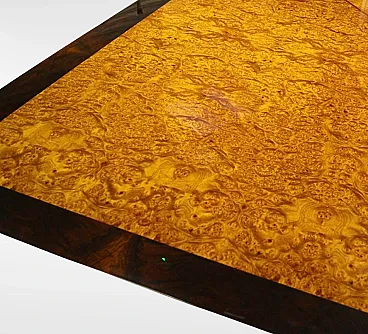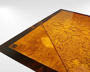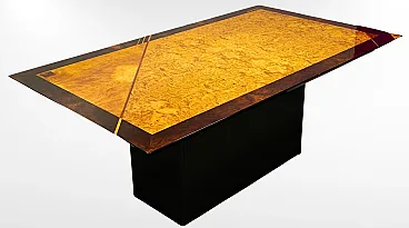 Luxurious dining table featuring a combination of burl wood, jointed and set into segments to create a unique and charming piece of furniture. The varieties of wood used are: walnut, olive and chestnut burls. The thick, glass-like Italian lacquer gives this desk/dining table a mirrored, polished look. Equipped with a protective glass top that protects the lacquered surface from scratches. The table rests on a black base in the shape of a rectangular cube. It can accommodate 8 to 10 people, depending on the size of the chairs. In excellent vintage condition, with small marks consistent with age.