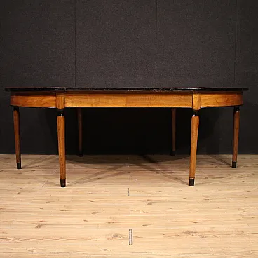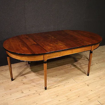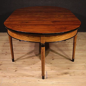 Pair of Italian console of the first half of the twentieth century. Sculpted furniture in walnut and cherry wood with ebanized borders of beautiful line and pleasant furniture. Pair of wall console that can be joined to form an extendable round table (original lengthening in the offer, see photo). Extendable table of beautiful extent and excellent service, it can reach the maximum length of 224 cm. Table that once mounted offers good stability and solidity, ideal to be inserted in a room or salon, for antique dealers and furnishings. Wall console leaning on three solid legs worked with ebanized decorations. Wooden plans in good condition with some sign of wear and restoration (see photo). Structurally healthy mobile, overall in good condition. Closed table H 79 x l 130 x p 128 cm - Console crescent H 79 x l 130 x p 64 cm