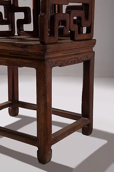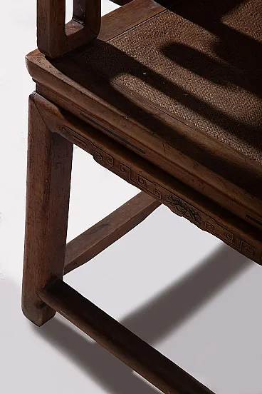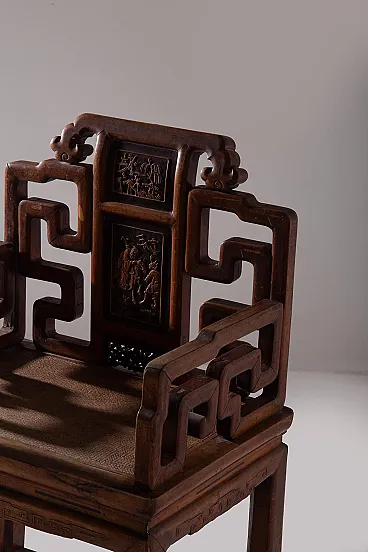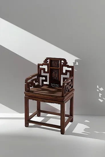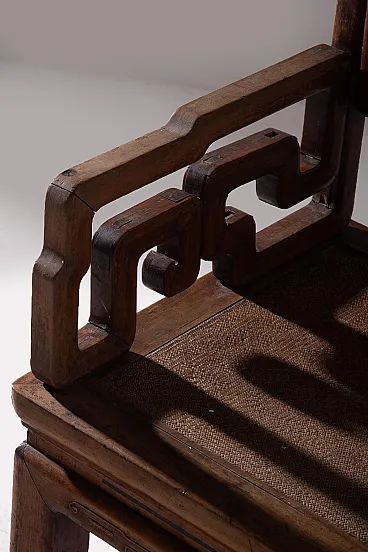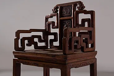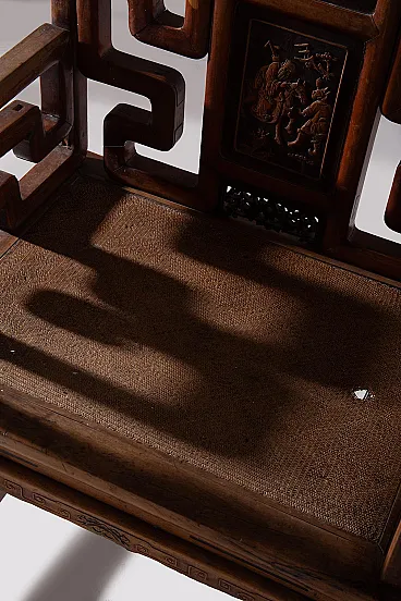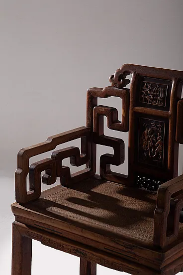 This splendid Chinese chair, crafted in the Qing style, captivates attention with its exceptional craftsmanship and intricate design that embodies a deep connection to Eastern cultural tradition. Made from fine wood, its structure is solid and robust, characterized by timeless beauty. The arms and backrest are defined by bold geometric lines, enriched by graceful curves that convey both elegance and strength. The focal point of this chair is undoubtedly the backrest, where two beautifully carved scenes can be admired. The upper scene depicts a peaceful landscape, with a bridge stretching across the riverbank, evoking a sense of calm and serenity. This setting could allude to a journey or a path taken, offering a visual narrative that speaks of movement and change. In the lower scene, a figure on horseback is greeted with reverence by a man on foot. It might represent a significant encounter, perhaps between a master and a servant, or between a noble and a traveler. The rich decorations and meticulous details of the characters and surrounding elements give the scene a vividness that invites the observer to immerse themselves in an ancient story. The strong and squared lines of the chair harmonize perfectly with these carvings, creating a balance between aesthetics and functionality. The wide, comfortable seat combined with the sturdy structure suggests that this chair may have been used in formal or ceremonial settings, expressing authority and respect. This piece represents not just an everyday piece of furniture but a true work of art, carrying with it a history, deep symbolism, and an intrinsic connection to Chinese culture. The carved scenes tell a story that goes beyond aesthetics, transforming the chair into an artwork reflecting the glorious past and refined taste of the Qing era. Perfect for enhancing any space with a touch of Eastern and historical art, this chair merges functionality and beauty in a flawless balance, destined to captivate anyone in search of a unique piece with timeless charm.