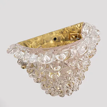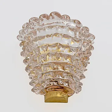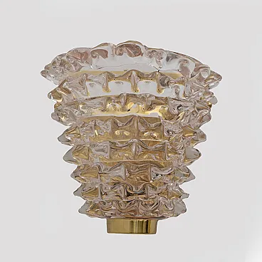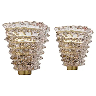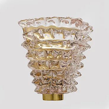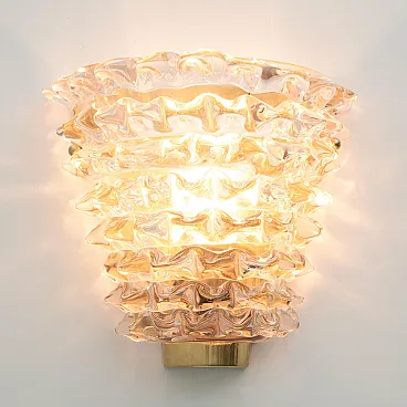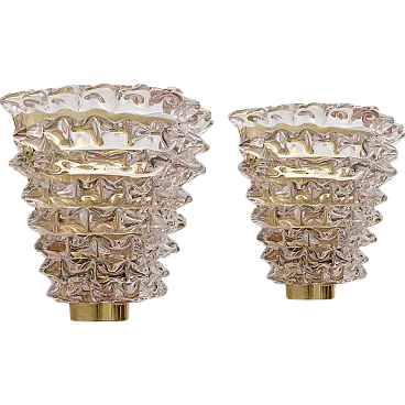Pair of Murano glass wall lamps with "Rostrate" ("beaked") glass cups and brass structure, in the style of Barovier and Toso. Each wall lamp is composed of a brass structure that allows the housing of a beautiful half dome in transparent pink Murano glass. The design is very clean and essential, but at the same time gives the wall lamp a very refined elegance. Its polished brass structure makes it very rich with a beautiful brass cone that then allows the Murano cup to be housed. The workmanship of the half cup in Murano glass is very beautiful, with small pins made when the glass is still hot. Refinement and style as in the Murano style of the time, unique pieces and pieces that always remain precious. Each lamp is equipped with a lamp holder with E27 attachment for Europe or E26 for the USA, rewired.