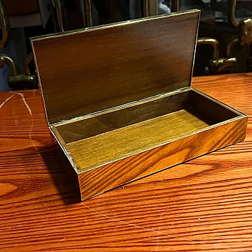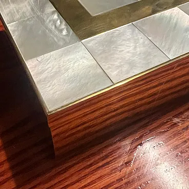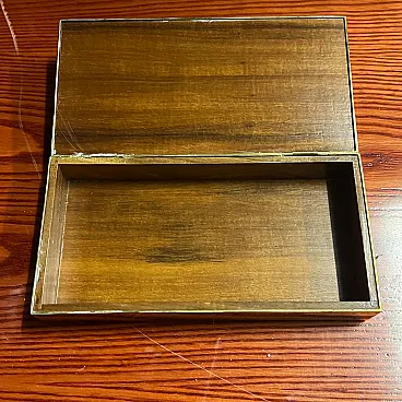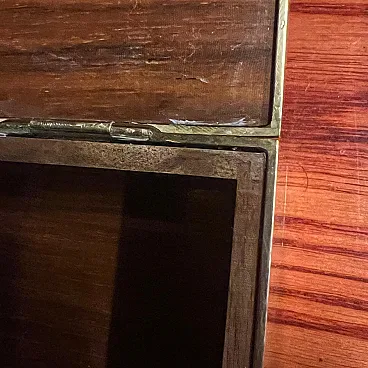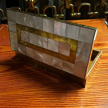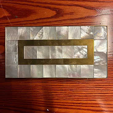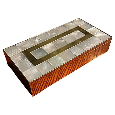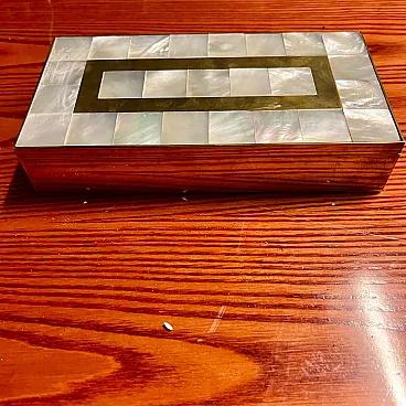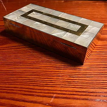 This box is a refined decorative object probably intended to hold small personal items or jewellery. The outside of the lid is decorated with a geometric pattern of mother-of-pearl tiles, creating a shiny, iridescent effect typical of this natural material. The golden inlay is made of brass, adding a touch of elegance and refinement, while the contrast between the metal and the mother-of-pearl lends a luxurious appearance. The body of the box, visible on the inside and outside edges, has a varnished wood finish, probably polished natural wood for a smooth and warm effect. This combination of materials, with the use of wood, brass and mother-of-pearl, recalls a classical style and could indicate a Middle Eastern or Asian origin, areas known for the use of mother-of-pearl and brass in handcrafted objects.