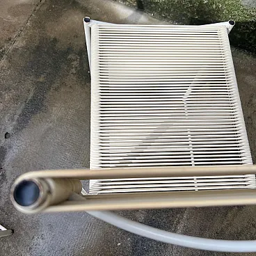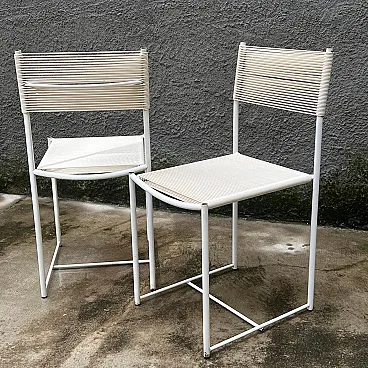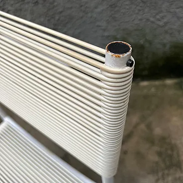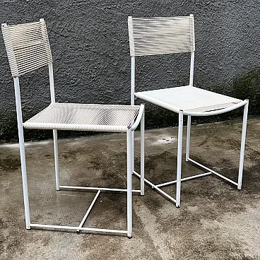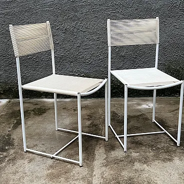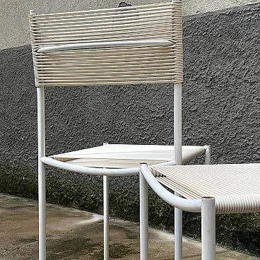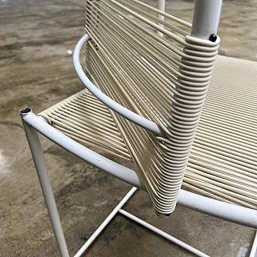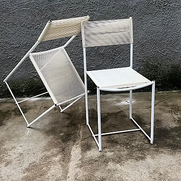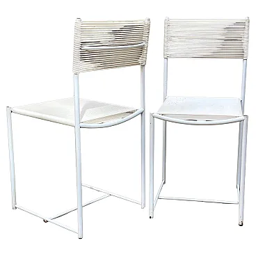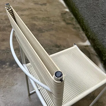 Questa coppia di sedie è un esempio classico del design minimalista e funzionale degli anni '70, progettata da Giandomenico Belotti per Alias. Si tratta delle celebri sedie “Spaghetti”, caratterizzate da una struttura in ferro verniciato bianco e da seduta e schienale composti da fili elastici in plastica, che conferiscono un aspetto leggero e moderno. Le sedie qui fotografate sono in ottime condizioni, senza alcun danno strutturale. Un aspetto notevole è che tutti i cordini elastici che compongono la seduta e lo schienale sono integri, garantendo sia estetica che funzionalità. L'interazione fra i materiali – il metallo e la plastica – crea un design iconico che si distingue per la semplicità e l'ergonomia. Giandomenico Belotti è stato un designer italiano noto per la sua capacità di coniugare estetica e funzionalità. Nato nel 1922, Belotti ha progettato mobili che si inseriscono nel contesto del design moderno del dopoguerra, privilegiando linee pulite e materiali innovativi. La sedia Spaghetti è probabilmente la sua opera più conosciuta, un prodotto che è diventato un'icona del design italiano, tanto da essere esposta in musei come il MoMA di New York. Alias è un'azienda italiana fondata nel 1979, nota per la sua produzione di mobili di alta qualità e design all'avanguardia. Ha collaborato con molti designer di fama internazionale, affermandosi come uno dei principali protagonisti del design italiano. La filosofia di Alias si basa su un mix di sperimentazione, innovazione e rispetto per la tradizione, portando a prodotti che sono funzionali, leggeri e spesso caratterizzati da una grande pulizia formale. La collaborazione con Belotti per la sedia Spaghetti è stata una delle pietre miliari della sua crescita internazionale. In sintesi, queste sedie rappresentano non solo un pezzo di arredamento, ma anche un importante capitolo della storia del design contemporaneo, in perfetto equilibrio tra estetica e funzionalità.