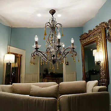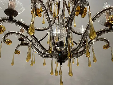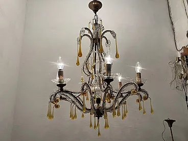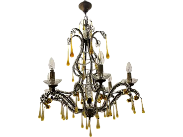 Additional Item Information - Crystal Beaded Murano Chandelier 1950's Height with chain 86 cm Height without chain 76 cm Width 66 Features 6 lights Crystals cover the entire frame that is embellished with hanging gold honey colored Murano glass drops. Wiring checked by our electrician