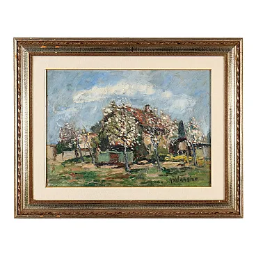 Oil on cardboard. Signed lower right. Further signature, date, title and handwritten declaration of authenticity on the back. Giovanni Balansino, Piedmontese by origin but Lombard by adoption, chose to depict his love for both lands with his painting made of broad and nervous brushstrokes, dedicating a large part of his production to them. In the proposed painting, the title is from the white flowering of the trees that surround the country house. The work is presented in a frame.