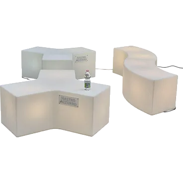 Set composed of 4 modular and bright polyethylene benches, 2 Ypsilon model with dimensions 100x120 h. 43 (3xE27 15W) and 2 Snake model with dimensions 123x53 h. 43 (2xE27 15W). Slide company, early 2000.