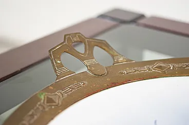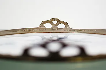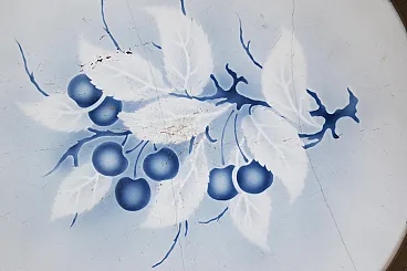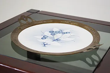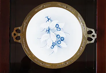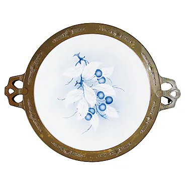 Antique Brass and Ceramic Tray with Handles – 1950s/1960s Elegance This exquisite antique tray embodies mid-century sophistication with a harmonious blend of brass and ceramic craftsmanship. Ideal as a statement centerpiece or functional serving tray, it seamlessly combines vintage charm with practical elegance. Key Features Material: Frame: Intricately detailed brass with embossed relief decorations, showcasing timeless craftsmanship. Center: A ceramic plate adorned with a delicate hand-painted design featuring soft blue berries and white foliage, evoking a serene and refined aesthetic. Handles: The elegantly shaped brass handles add both functionality and decorative appeal, perfect for easy carrying and display. Dimensions Diameter: 46 cm (18.1 in) Height: 3 cm (1.2 in) Condition The tray is in very good vintage condition, with minor wear on the brass consistent with age, adding to its character and authenticity. The ceramic surface remains vibrant and intact. Why Add This Tray to Your Collection? This 1950s/1960s antique tray is more than just a functional piece—it’s a work of art. Whether used for serving or displayed on a sideboard, its intricate detailing and harmonious blend of materials make it a conversation starter. Perfect for vintage collectors or those seeking a touch of mid-century charm in their home. Don’t miss this elegant piece that bridges beauty and utility with timeless sophistication!