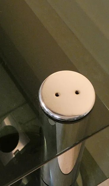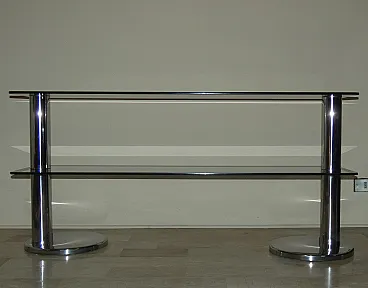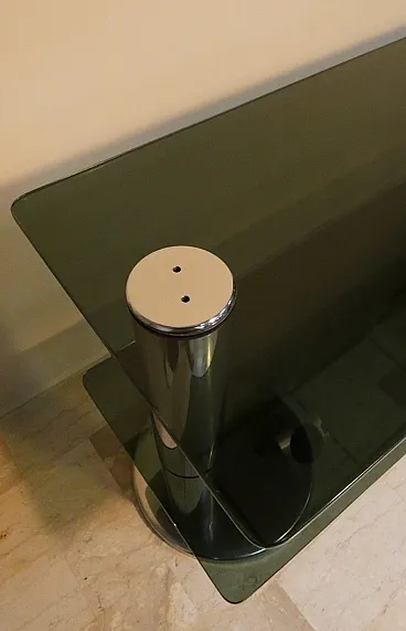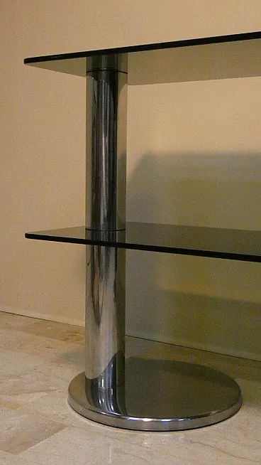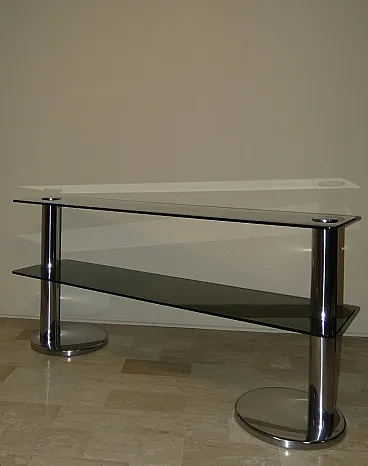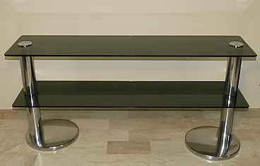 Italian console in smoked glass and steel, 1970s. Chromed steel structure, with two round columns and two smoked glass shelves. Chrome plating, Smoked glass, Steel.