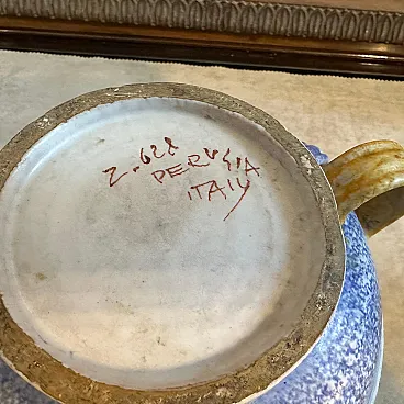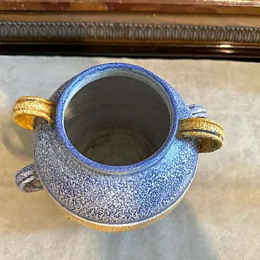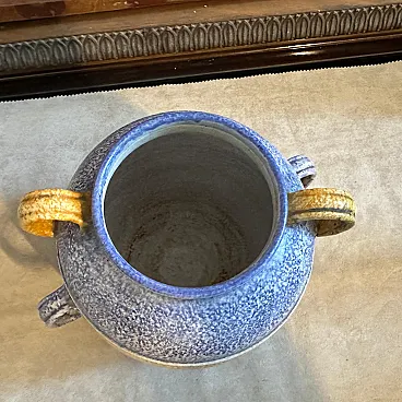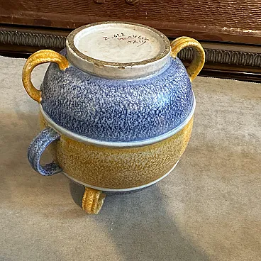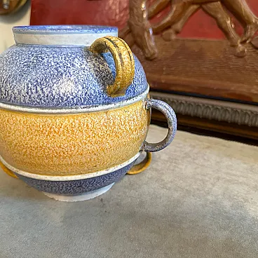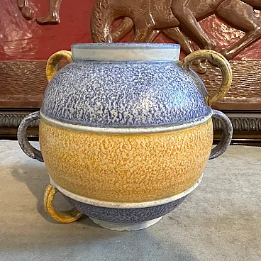 This vase is a beautiful blend of geometric design, rich textures, and vibrant colors. The polychrome ceramic exhibits a layered color scheme: bands of blue and golden-yellow dominate the piece, divided into distinct sections. The texture of the ceramic surface appears slightly rough and speckled, adding to the tactile aesthetic typical of the Art Deco and Futurist styles. The vase has a spherical form with six prominent looped handles symmetrically arranged around the body. The handles, which are a golden yellow, complement the color scheme, adding functionality and visual interest. The bold, contrasting colors and streamlined form are in line with Futurist aesthetics, emphasizing speed, modernity, and a dynamic sense of movement, while the influence of Art Deco is seen in its elegant, clean lines and geometric balance. This type of vase, crafted in Albisola, a famous ceramics hub in Italy, would have been a fine example of modern Italian craftsmanship during the 1930s, reflecting both local ceramic traditions and the broader European artistic movements of the time. The vase it's in perfect condition