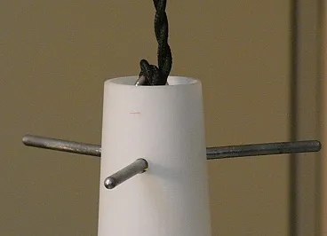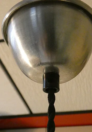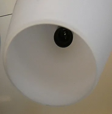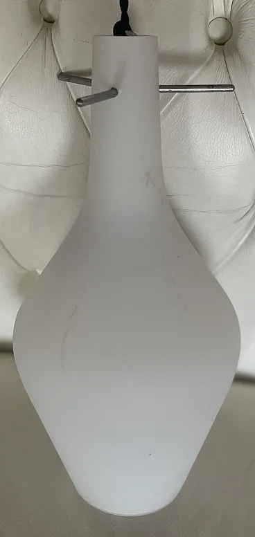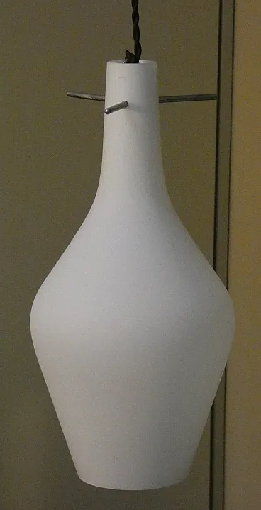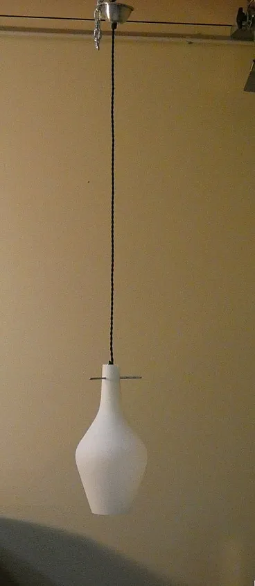 Extremely elegant and rare mid-century modernist Italian opaline glass and iron pendant lamp, dating back to the 1950s and reminiscent of the Stilnovo and Arredoluce lights of the same period. The lamp has new safety wiring, is functional and has a bulb connection (E27). Brass has a patina commensurate with age; The opal glass shade is in excellent condition, with no cracks or damage... only a few very light shadows of age evident in the last image. The height of the lamp is adjustable. Maximum height: 120 cm Diameter: 18cm