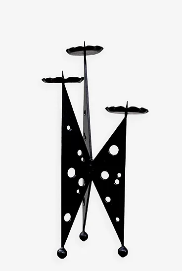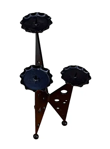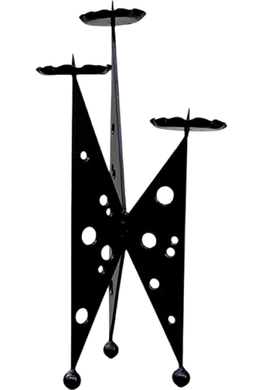 A unique metal candle holder from Poland from the late 70s or early 80s, which perfectly reflects the character of this period. Made in a style inspired by brutalism and modernism, it features a geometric and raw design. Three candle tips are placed at different heights, which creates a dynamic, sculptural shape and attracts attention. The characteristic triangular legs with perforations of different sizes underline the industrial style, typical of Polish design of those years. The candlestick is an example of Polish artistic craftsmanship of this period, in which designs combining simplicity and distinctive geometric character were popular. It may have been created in one of the Polish craft cooperatives, such as Cepelia, which specializes in the production of metal decorations for both the domestic market and export.