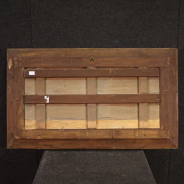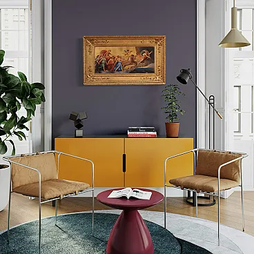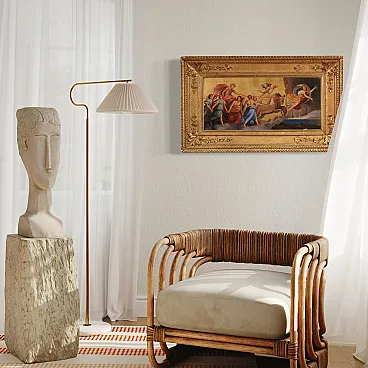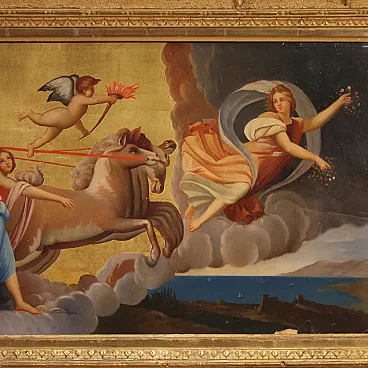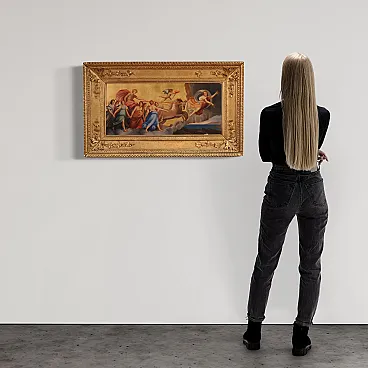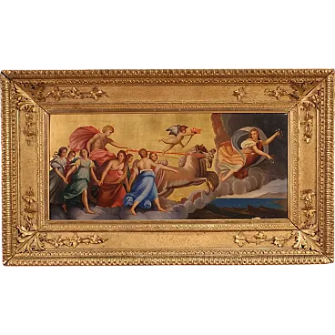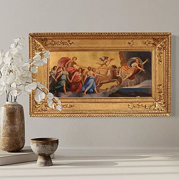 Italian painting from the first half of the 19th century. Oil on panel work of notable pictorial quality depicting a mythological scene of great pleasure. We find the iconographic prototype of the Chariot of Dawn that Guido Reni frescoed in 1614 for the ceiling of the central hall of the Casino adjacent to the Palazzo Pallavicini-Rospigliosi, commissioned by Cardinal Scipione Borghese. Apollo drives the golden chariot of the sun and brings the light of the new day to earth. The Aurora precedes the race of the sun and chases away the darkness of the night while a winged cherub, the twilight, raises a torch. Young girls, the Hours, dance around the sun in a triumph of light with a gold background. Spectacular contemporary frame in wood and gilded plaster, with some defects (see photo). Work with small drops of color, overall in good state of conservation. Painting part of a pair, see photo and ask for the price of the matching paintings if still available. Light painting H 35 x W 78 cm.