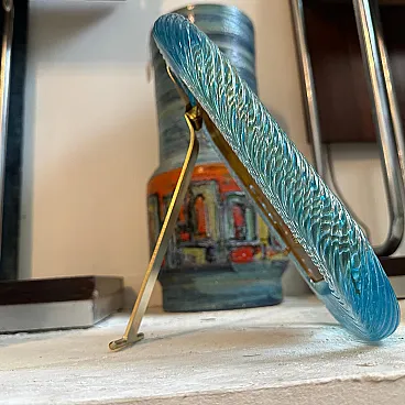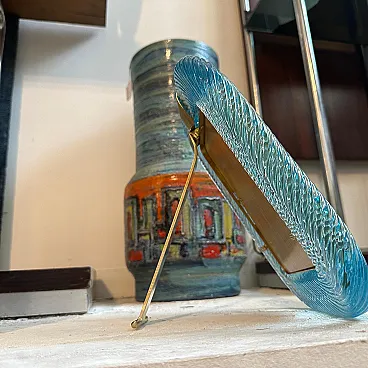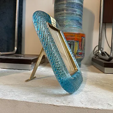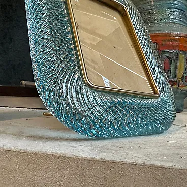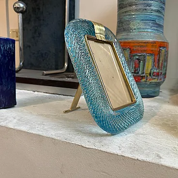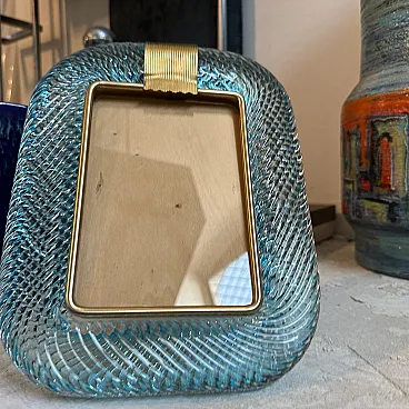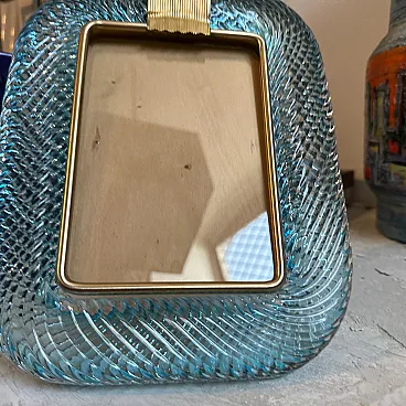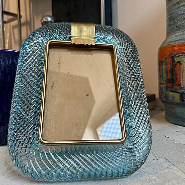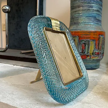 A light blue Murano glass picture frame designed and manufactured in Venice in the style of Barovier in lovely condition. The vintage photo frame is a beautiful and elegant piece of decor that is perfect for displaying your favorite memories in style. Barovier is a renowned Italian glass-making company that has been in operation since 1295, and its products are highly valued by collectors and design enthusiasts alike. The photo frame features a rectangular shape with a solid brass clean internal frame. The outer part of the frame is made of turquoise Murano glass, carefully crafted by skilled artisans, with each piece being unique due to the nature of the glass-making process. This photo frame is a perfect example of the Art Deco style that was popular in the early 20th century, characterized by bold geometric shapes, sleek lines, and a focus on luxury and craftsmanship. The photo frame is a timeless piece that will add elegance and sophistication to any room