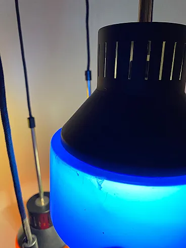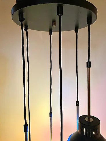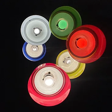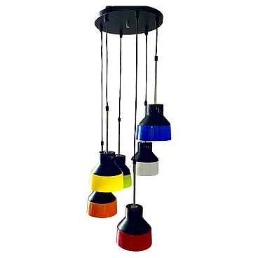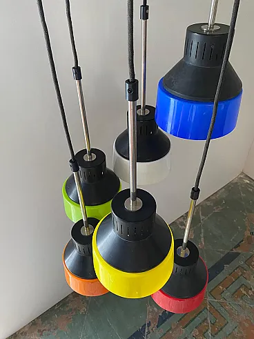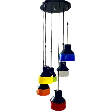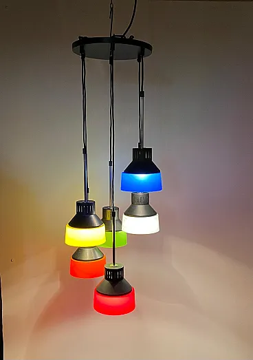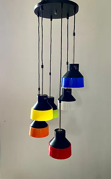Mid century modern waterfall chandelier Vintage mid-century modern Cascade model chandelier made in Italy in the 1960s. Six pendant light points made of iron and multicolored plastic lampshades. Adjustable height of the light points thanks to its cable system (we can do it for you). The iron parts have been polished and repainted. The electrical parts have been overhauled and work perfectly. Few signs of aging and a micro crack on one of the lampshades (please look at the photo), not visible once the chandelier is hung from the ceiling. Shipping takes place in a sturdy wooden crate and with insurance coverage. Immediate refund up to 100% in case of damage during transport. Visit our profile page to check out our constantly updated original vintage collection of over 200 pieces (and all fully restored). Significant savings on shipping costs for multiple purchases.