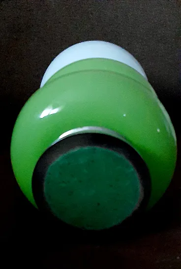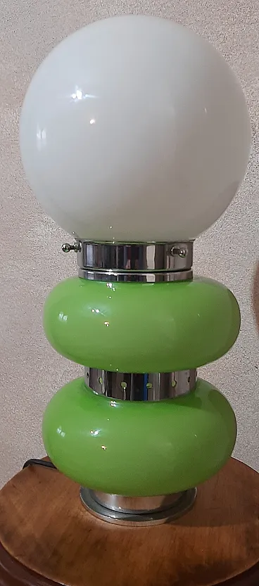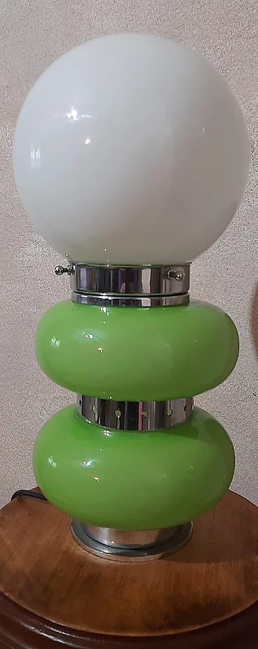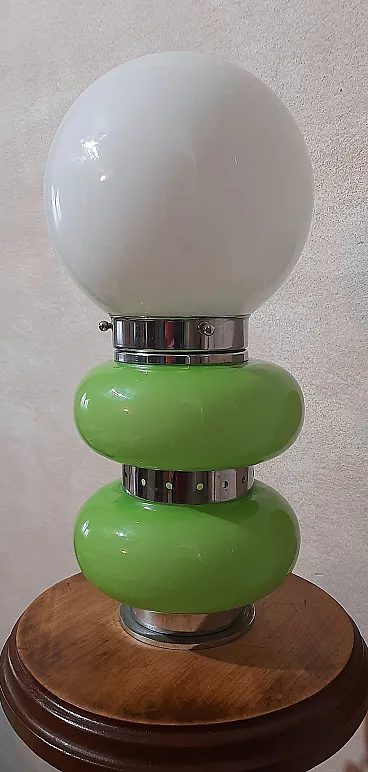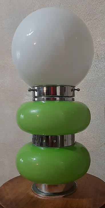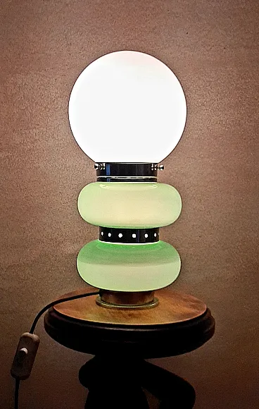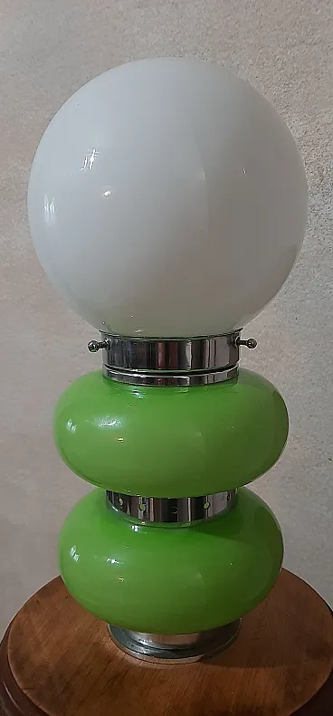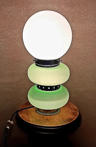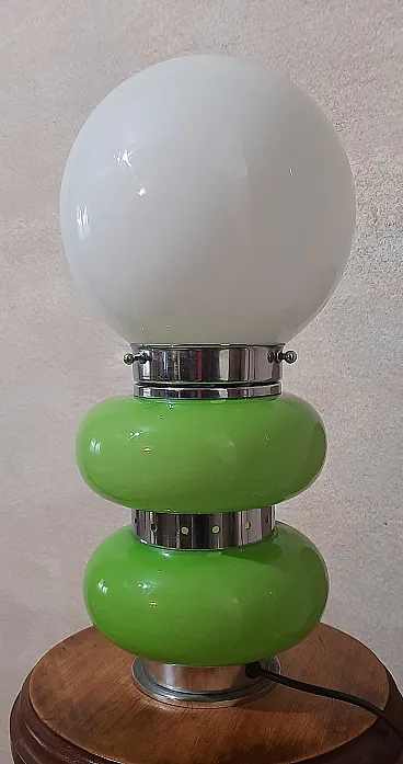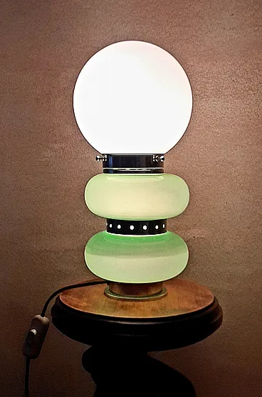 Table lamp, in Murano glass, 1960s/70s, in opaline glass and chrome, green and white colour, in perfect condition and working. Measurements: h.35x18x18cm