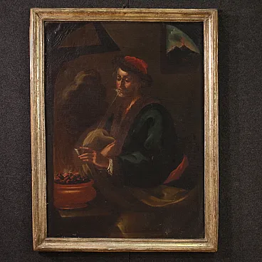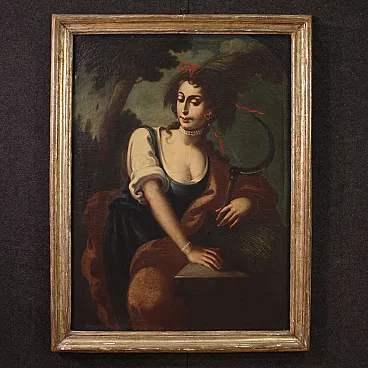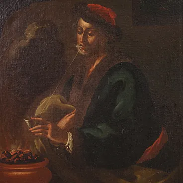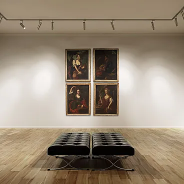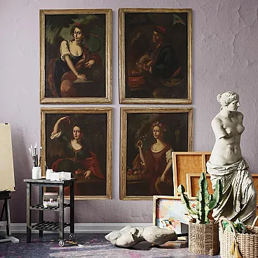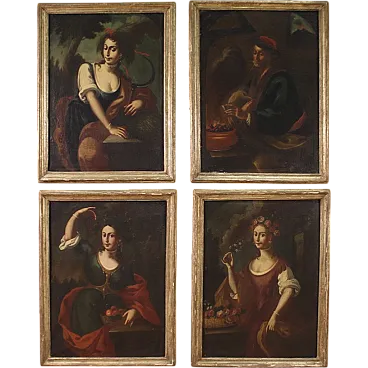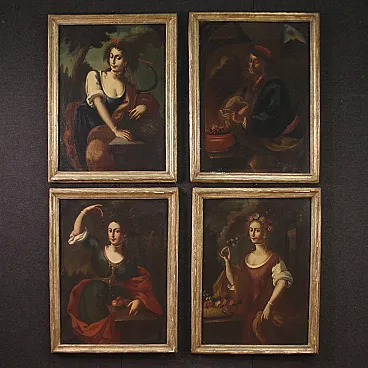 Elegant group of four Italian paintings from the second half of the 18th century. Oil works on canvas depicting the allegory of the four seasons, of notable pictorial quality and difficult to find. Spring is represented as a young girl immersed in flowers and summer as a woman preparing for the harvest with a sickle in her hand. Autumn is a beautiful girl with a fruit basket holding a bunch of grapes while winter is depicted as an old man smoking in an interior lit by hot coals. To underline the skill with which the girls' clothes, jewels and some meticulous naturalistic details were created. Contemporary frames in carved and Mecca-gilded wood, with some gilding losses (see photo). Paintings on first canvas which show some signs of aging, overall in good state of conservation. Light paintings H 101 x W 74 cm.