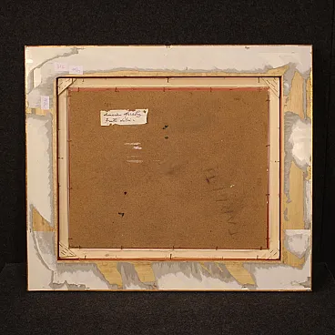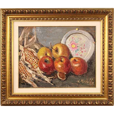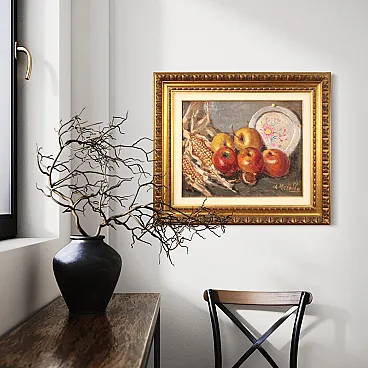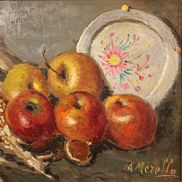 Italian painting from the mid-20th century. Oil on masonite work depicting still life Sweet fruits of good pictorial quality. Painting of nice size and pleasant decor signed A. Merello on the bottom right (see photo) referable to the painter Amedeo Merello (1890-1979) lacking authentication. Painting of excellent brightness adorned with a wooden and plaster frame, sculpted, gilded and complete with fabric passe-partout (see photo). Work that can be easily placed in different parts of the house, for antique dealers, interior designers and collectors of 20th century Italian paintings. In good condition. Painting light H 38.5 x W 48 cm.